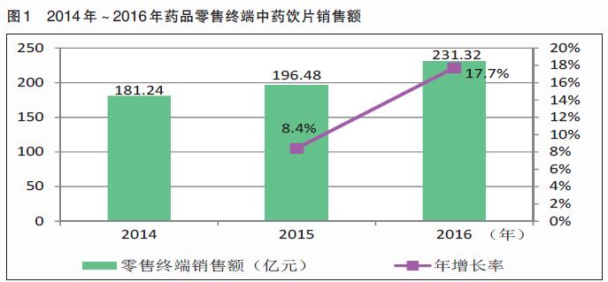 據統計,2016年中藥飲片零售終端市場的銷售額為231.32億元,同比增長17.7%(見圖1)。其增長速度超過了同年度零售終端西藥、中成藥將近十個百分點,是零售藥店銷售額增長最快的品類。《報告》認為,中藥飲片在零售市場表現優異,主要得益于國家政策助力中醫藥的發展,而消費者養生調理保健需求的日益提升,也使得中藥飲片在藥品零售市場實現了價值回歸。